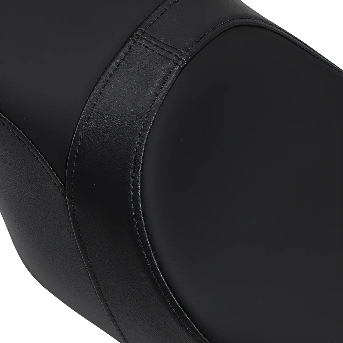 The Drag Specialties Predator 2-Up Seat is designed for both rider and passenger comfort. Featuring solar-reflective leather in the seating area, this seat keeps you cooler by reducing surface temperature by as much as 25°F compared to conventional leather or vinyl. Automotive-grade vinyl on the sides ensures long-lasting durability. The 3/16" ABS thermoformed seat base provides a solid foundation, complete with a carpeted bottom and rubber bumpers to protect your motorcycle's paint. The molded polyurethane foam offers exceptional support and cushioning for a comfortable ride, mile after mile. This 2-up seat features black stitching and a smooth decoration.