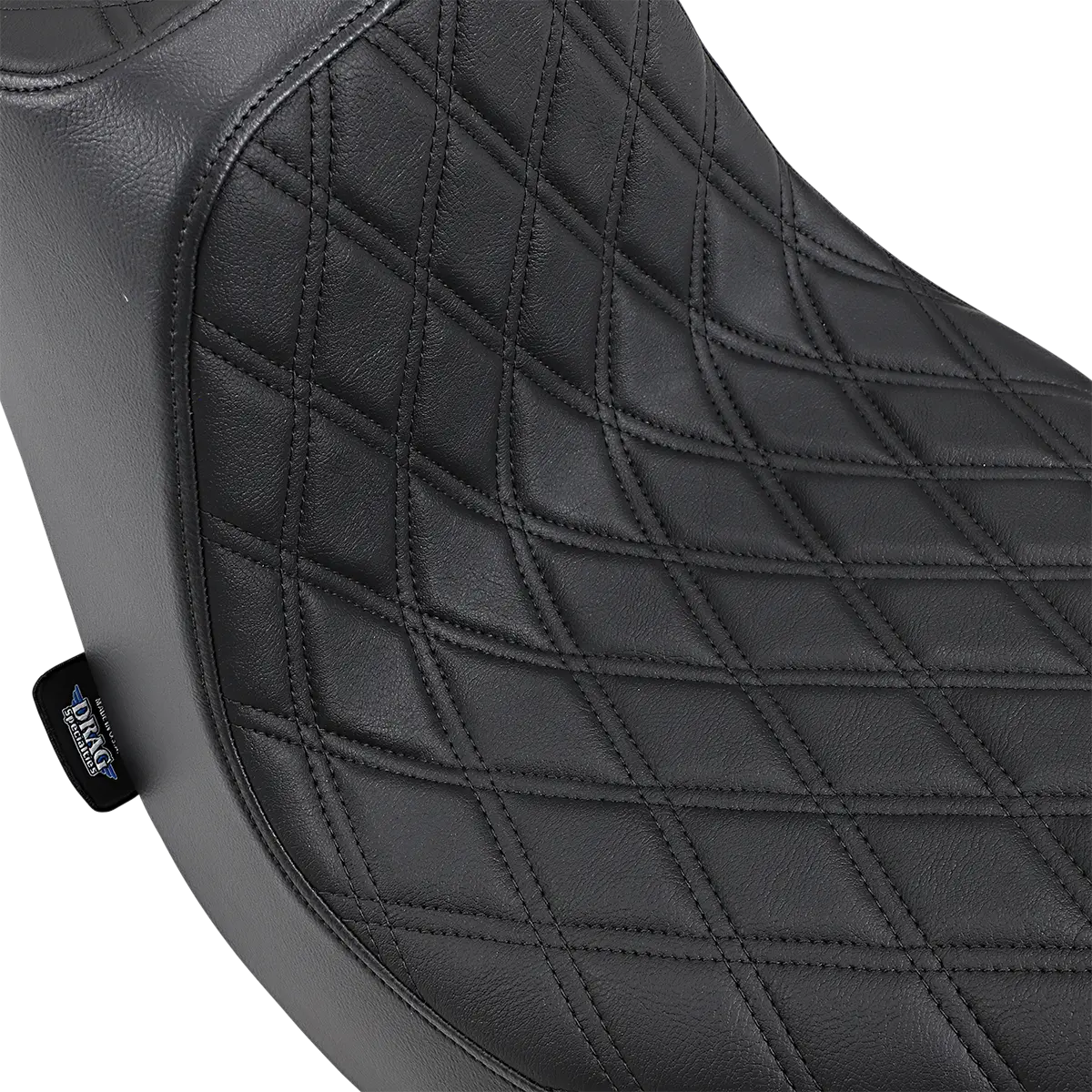 The Drag Specialties Predator III Seat features a durable automotive-grade vinyl cover that withstands the elements and provides a premium look. The molded polyurethane foam ensures optimal comfort and support, even on long rides. Its 3/16" ABS thermoformed seat base guarantees a perfect fit and includes a carpeted bottom with rubber bumpers to protect your motorcycle's paint. This one-piece seat is designed with a narrow front, providing improved leg clearance for enhanced control and comfort. Compatible with all Drag Specialties and most Harley-Davidson sissy bars, installation is a breeze with all necessary mounting hardware included. Proudly made in the USA, the Predator III Seat combines quality craftsmanship with superior design to elevate your riding experience. The black stitching complements the double diamond decoration, adding a touch of sophistication to your motorcycle.
