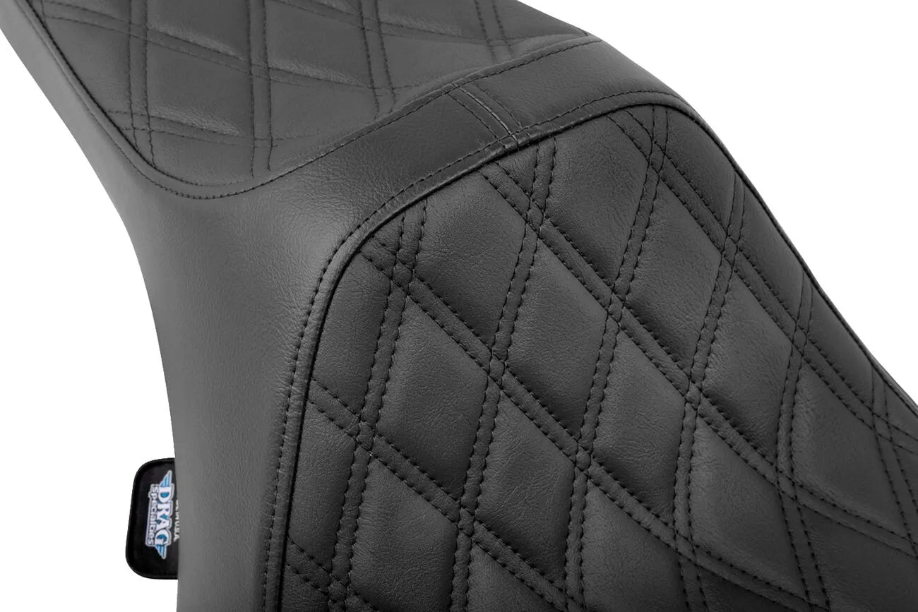The Drag Specialties Predator III Seat is designed for both rider and passenger comfort. Its automotive-grade vinyl cover offers excellent resistance to wear and tear, ensuring long-lasting good looks. The molded polyurethane foam provides superior cushioning, making even long rides enjoyable. The seat features a 3/16" ABS thermoformed seat base, guaranteeing a precise fit and stability. A carpeted bottom and rubber bumpers protect your motorcycle's paint from scratches and scuffs. The narrow front design allows for improved leg clearance, enhancing control and comfort. Compatible with Drag Specialties and most Harley-Davidson sissy bars, this seat installs easily with the included mounting hardware. The double diamond stitching adds a touch of style to your motorcycle. This is a 2-Up seat that provides space for both rider and passenger.