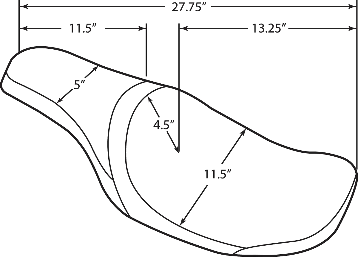 The Drag Specialties Predator Seat is meticulously crafted with a custom-molded polyurethane foam interior, providing exceptional comfort for long rides. Its 3/16" ABS thermoformed seat base guarantees a perfect fit on your motorcycle. The fully carpeted bottom protects your bike's paint from scratches and wear. Designed to fit all Drag Specialties and most H-D sissy bars, this seat sits approximately 1" lower than the stock seat (unless otherwise noted), offering a streamlined aesthetic. The seat also features black stitching for a mild stitched decoration and is designed to fit standard-sized tanks. With an overall length of 70.5 cm (27-3/4"), a driver seat length of 33.5 cm (13-1/4"), and a driver seat width of 29 cm (11-1/2"), the Predator Seat provides ample support and comfort. Upgrade to a Drag Specialties Predator Seat for a superior riding experience.