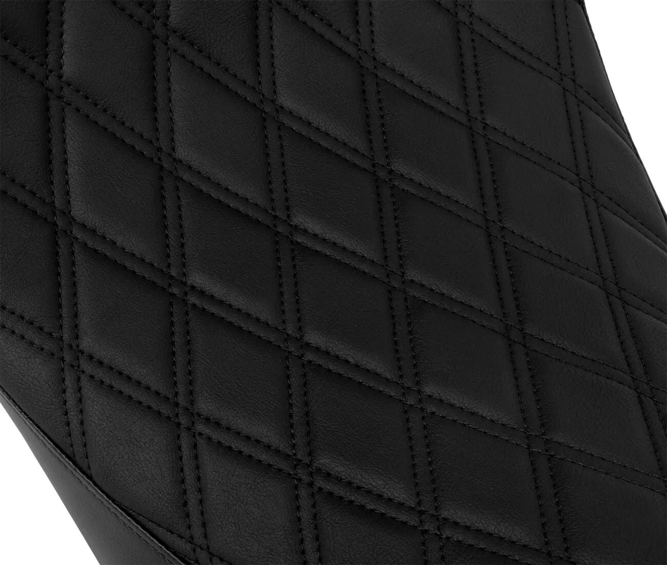 The Drag Specialties Solo Front Seat is engineered for maximum rider comfort and a sleek aesthetic. Featuring a 5.5" tall driver support with unique styling, this seat ensures excellent back support. The contoured seating area enhances comfort, while the narrow front design allows for improved leg clearance. Constructed with molded flexible urethane foam and a 3/16” ABS thermoformed seat base, this seat guarantees a perfect fit. The fully carpeted bottom and rubber bumpers protect your motorcycle's paint. This solo seat is compatible with narrow and wide solo rear seats, offering versatility for customization. For added comfort, an optional backrest with EZ glide II capabilities is available (sold separately). Made in the USA, this seat combines quality craftsmanship with superior design. The black stitching complements the double diamond decoration, adding a touch of elegance to your motorcycle.