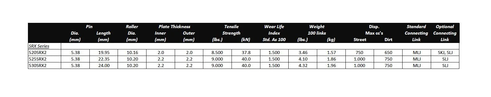 The EK 530 SRX2 Drive Chain is built to last, featuring lightening holes that reduce weight without compromising strength. The innovative Quadra X-Ring design significantly extends chain life, providing 1.5 to 2 times the lifespan of a standard O-ring chain. This advanced seal technology keeps lubrication in and contaminants out, minimizing wear and maximizing performance. Suitable for motorcycles with up to 1000cc displacement (street) or 750cc (offroad), this chain offers superior tensile strength, rated at 40 kN (8995 lb), ensuring reliable power delivery and peace of mind. Installation is straightforward with the included rivet connecting link, providing a secure and dependable connection. Experience the difference of EK's commitment to quality and performance with the 530 SRX2 drive chain.