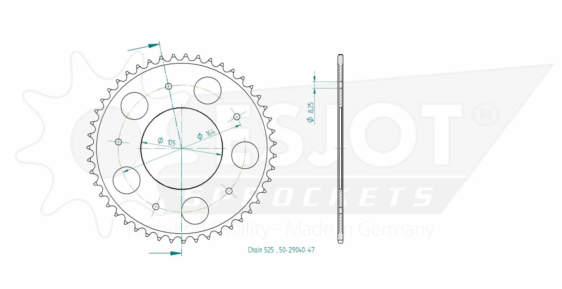 Manufactured in Germany, the Esjot 525 rear sprocket utilizes high-strength QSTE460 steel, ensuring exceptional wear resistance and longevity. The advanced Diamond Cut 2.0 toothing process guarantees precise engagement and smooth power transfer. Its special surface treatment provides enhanced protection against corrosion and wear. With concentricity and axial run-out tolerances of less than 0.1 mm, this sprocket offers optimal performance and reliability for your motorcycle. Upgrade to Esjot and experience the difference in quality and durability.