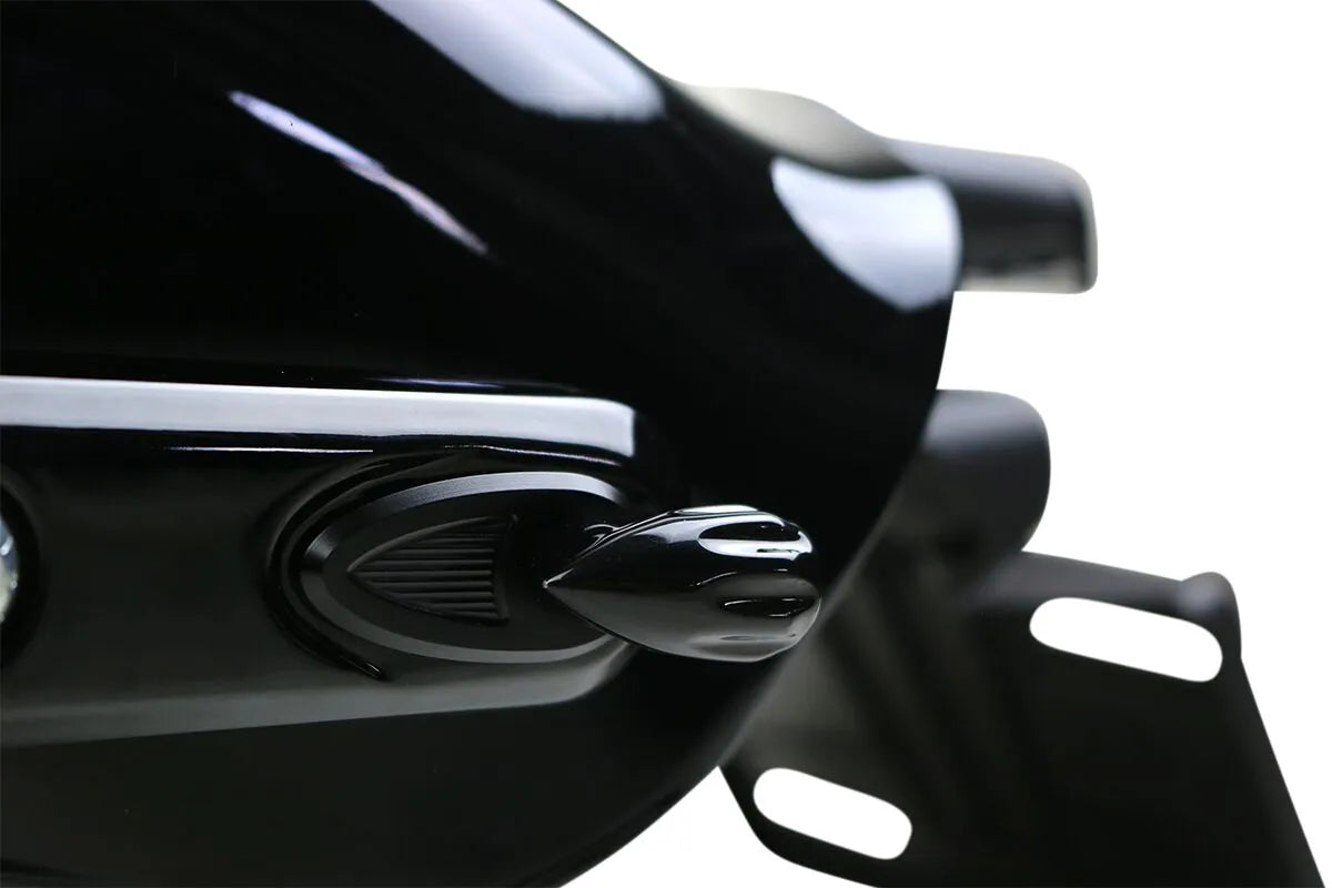 These CNC-machined billet aluminum plates are designed to cover the two holes (one round, one oval) left after removing the original turn signals. They seamlessly integrate with your motorcycle's existing aesthetics while providing a mounting solution for aftermarket lighting. Compatible with all Kodlin LED indicators, as well as any aftermarket lights equipped with 8 mm mounting studs. The black finish ensures a sleek and cohesive look. Installation is straightforward, though minor modifications to the strut may be necessary on older Sportster, Dyna, and Softail models to achieve a perfect fit.