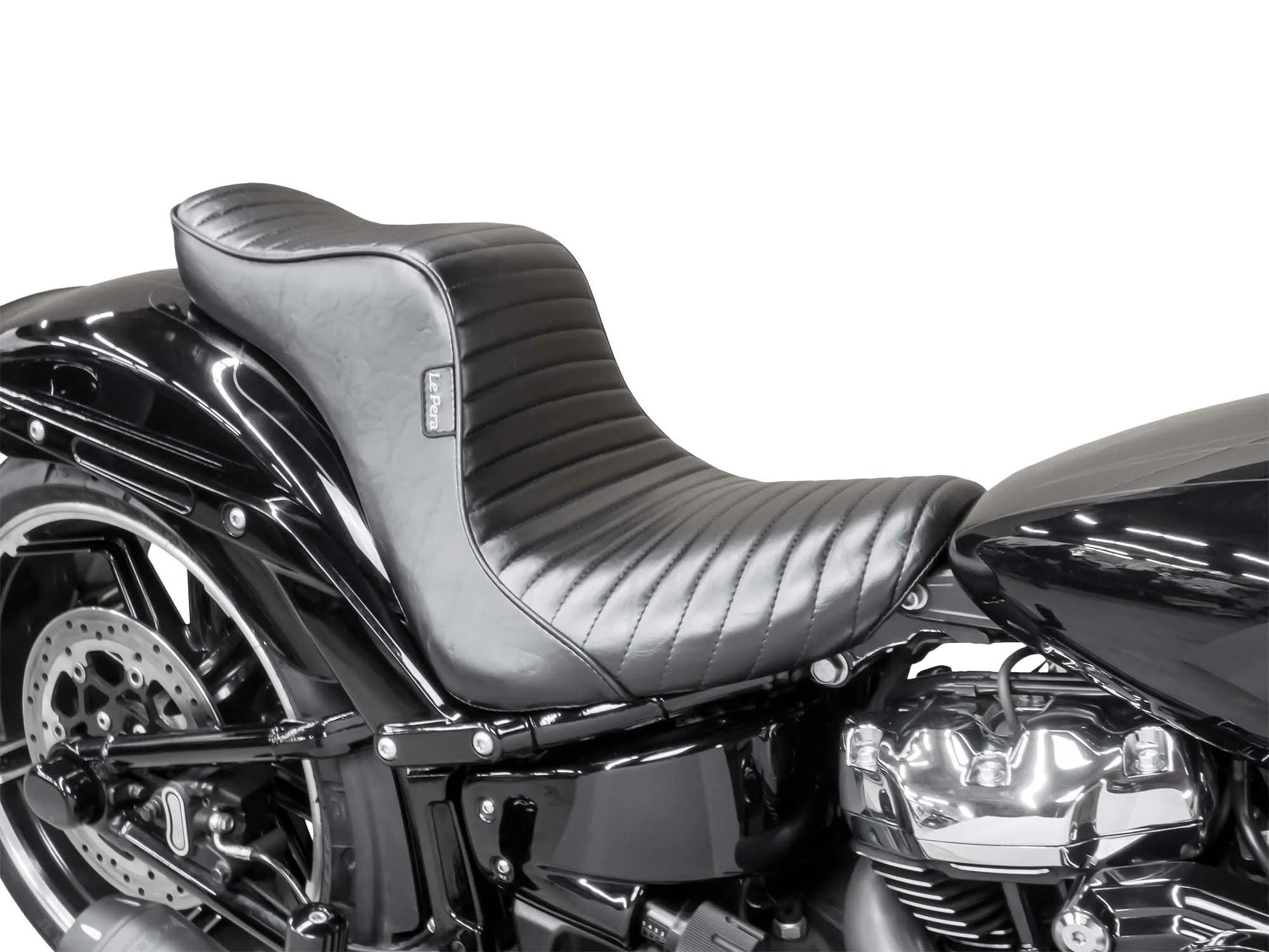 The Le Pera Cherokee Seat is meticulously crafted to offer a perfect blend of aesthetics and functionality. Its pleated design adds a touch of classic style, while the carefully shaped contours provide exceptional lumbar support for the rider. Designed as a 2-up seat, it comfortably accommodates both the rider and passenger. The black color and finish ensure it complements any motorcycle, offering a seamless and integrated appearance. Enjoy enhanced riding pleasure with this premium quality, American-made seat. Easy to install and built to last, the Le Pera Cherokee seat will upgrade your riding experience.