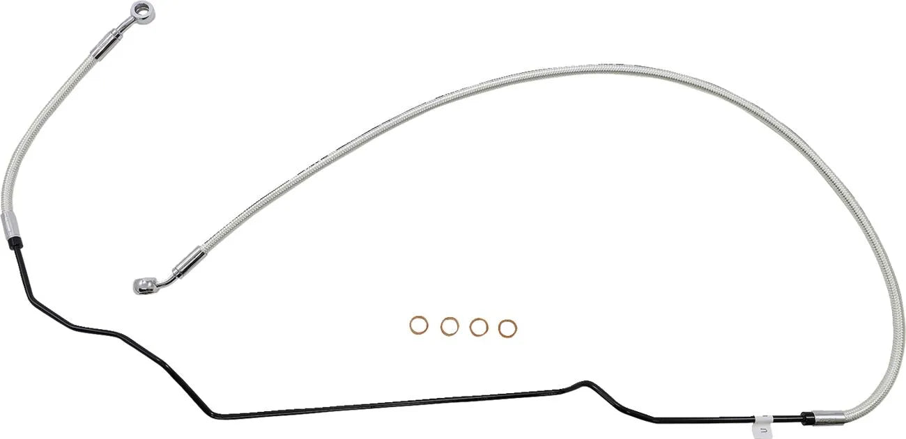 The Magnum Shielding Braided Front Brake Line is engineered for optimal braking performance and longevity. Featuring a crystal-clear outer jacket, this brake line provides exceptional protection against scuffing paint or chrome, ensuring your bike maintains its pristine appearance. The braided design offers enhanced durability and reduces line expansion under pressure, resulting in a more responsive and consistent braking feel. The E-Z Align rotating caliper banjo allows for perfect, no-kink fitments, simplifying installation and ensuring optimal performance. The braid color and weave are meticulously matched to all Magnum control cables and brake lines, delivering a cohesive and custom look to your motorcycle. Proudly made in the U.S.A., this brake line reflects Magnum Shielding's commitment to quality and performance. Designed for braking systems with ABS and intended for the front, upper mounting position.