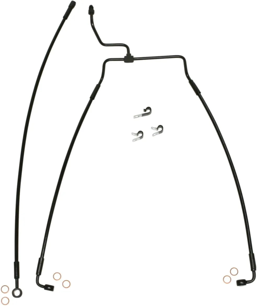 The Magnum Shielding XR Stainless Extreme Response Front Brakeline Kit is engineered to provide superior braking performance and durability. Its enhanced construction ensures optimal braking response, giving you greater control and confidence on the road. The inner PTFE tubing is braided with XR stainless steel reinforcement and embedded in a tough nylon outer jacket, offering exceptional protection for paint and chrome surfaces. The highly polished, chrome-plated fittings and brazed manifold construction provide a sleek appearance while eliminating leaks and alignment issues. With AN-3 connections for easy installation, this kit is a perfect upgrade for your motorcycle's braking system. This kit is specifically designed for motorcycles without ABS. Assembled in the U.S.A., this complete kit includes brake line assemblies that connect the caliper(s) to the master cylinder.
