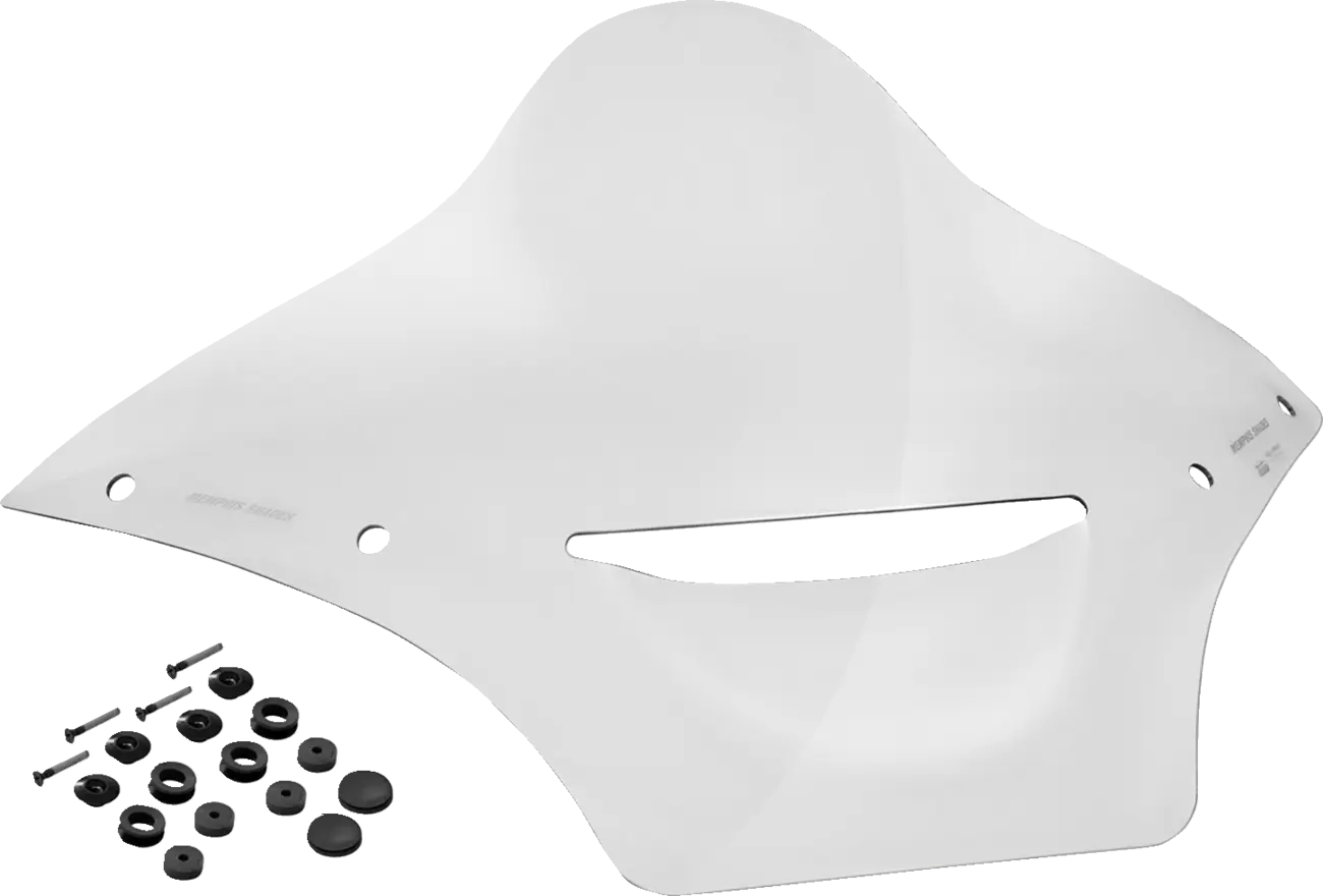The Memphis Shades Race Bubble Windshield is engineered for riders who demand both style and performance. Its sleek, aggressive profile not only enhances the look of your bike but also provides track-inspired aerodynamics for improved handling at higher speeds. A built-in vent optimizes airflow, reducing turbulence and wind resistance for a more comfortable and controlled riding experience. Constructed from durable 1/8" Lucite, this windshield offers exceptional clarity and impact resistance. The included windshield hardware ensures straightforward installation, and additional hardware is provided for bare fairing shell applications, catering specifically to track use. This windshield not only looks great but is also designed to perform under demanding conditions. The foam adhesive-backed pads protect your fairing's surface, preventing scratches and ensuring a secure fit.