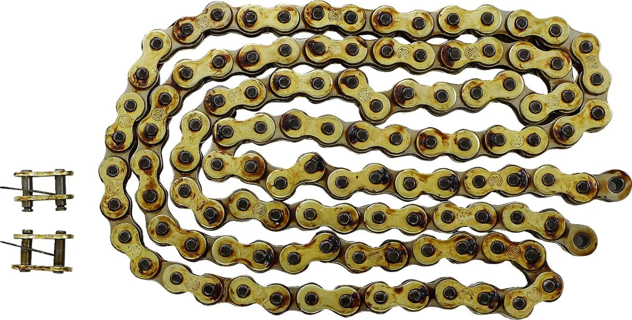 Specifically designed for motocross applications, the Moose Offroad 520 RXP Pro-MX chain is optimized for bikes between 125cc and 350cc. It features high-tensile-strength, nickel-plated inner link plates and rust-resistant, gold-plated side plates, providing superior strength and longevity. The high-application greased chain minimizes friction and maximizes power delivery. This non-O-ring chain offers low weight and reduced drag, making it ideal for competitive racing where every fraction of a second counts. With a tensile strength of 35.3 kN (7937 lb), this chain is built to withstand the rigors of aggressive riding and deliver consistent performance. Installation is straightforward with the included clip-type connecting link.