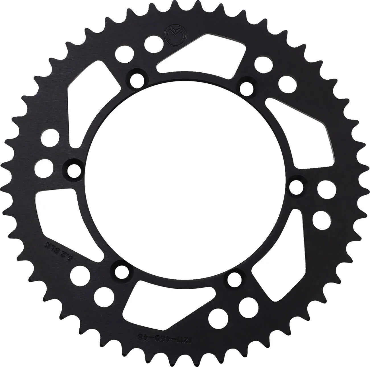 The Moose Offroad Rear Aluminum Sprocket is engineered for superior performance and longevity. Constructed from 7075 T651 aluminum, this sprocket undergoes an extra tempering process to minimize distortion and provide the ideal thickness, surpassing the performance of standard 7075 T6 sprockets. Each sprocket is 100% machined, eliminating stamping or grinding, resulting in unparalleled precision and strength. The optimized tooth thickness ensures maximum contact between the tooth and chain, maximizing power transfer and reducing wear. This rear drive sprocket is designed to withstand the rigors of off-road riding while enhancing your bike's overall performance. The black finish offers a sleek, professional look.