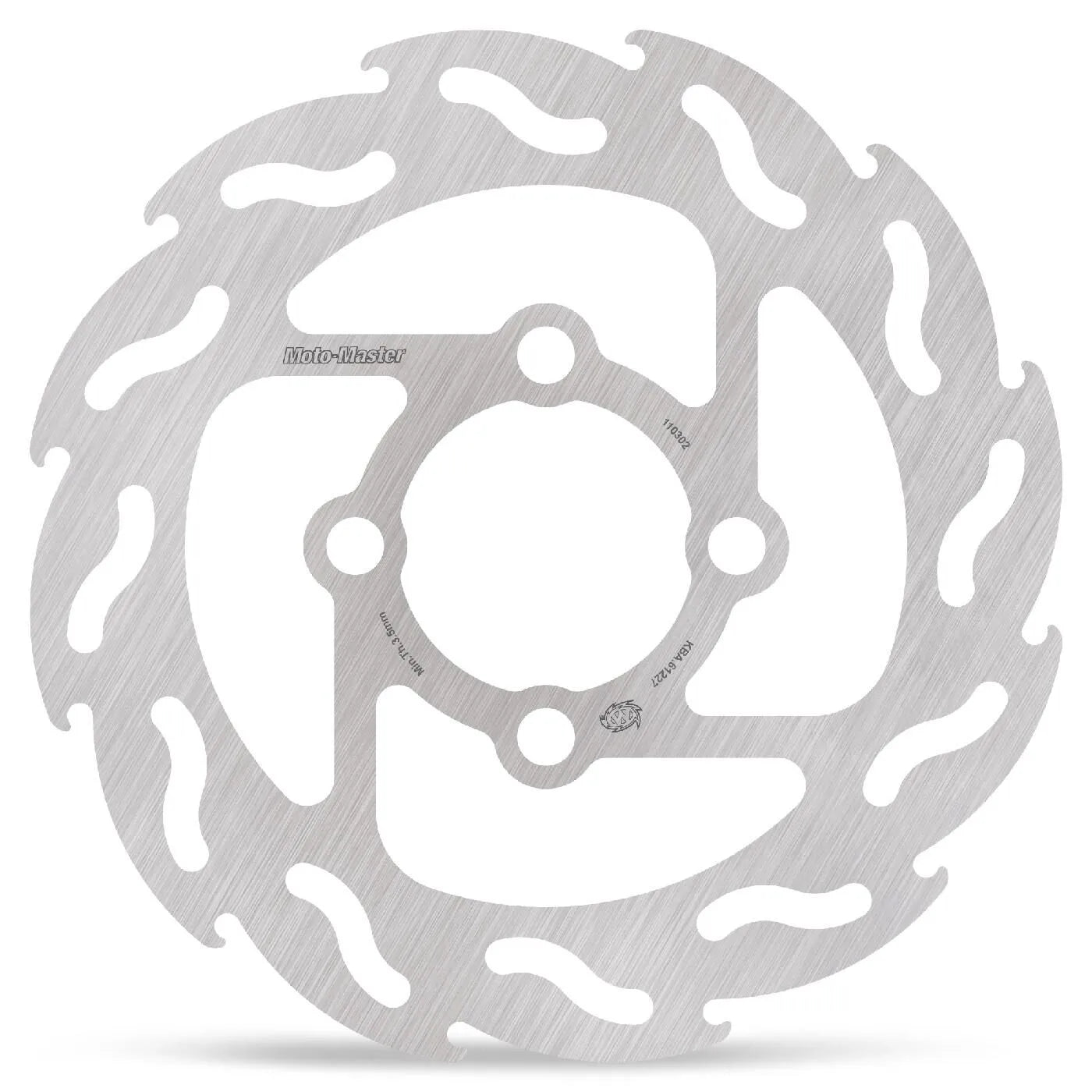 The Moto-Master Flame Series Rotor is engineered for optimal heat dissipation and efficient cleaning of the brake pad surface, thanks to its distinctive flame design. Precision double-grinding eliminates lever pulsation, ensuring smooth and consistent braking. The rotor's design provides equal brake pad contact throughout its rotation, delivering reliable and linear braking performance. Compatible with any type of brake pad, this rotor is a versatile upgrade for any motorcycle enthusiast looking to improve their bike's braking capabilities and overall performance. Installation is straightforward, making it an easy bolt-on upgrade.