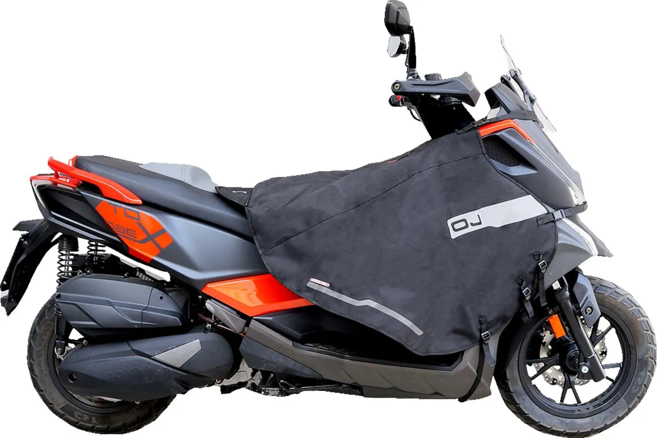 The OJ Leg Cover is designed for ultimate weather protection and rider comfort. Featuring a waterproof polyester outer fabric, it effectively shields you from rain and wind. The detachable quilted thermal lining provides extra warmth during colder rides, while anti-flap bars ensure the cover stays in place at higher speeds. Additional features include reflective strips for enhanced visibility and lateral pockets for convenient storage. With its adjustable straps and included mounting screws, installation is straightforward and secure. Enjoy a more comfortable and protected riding experience with this essential accessory.