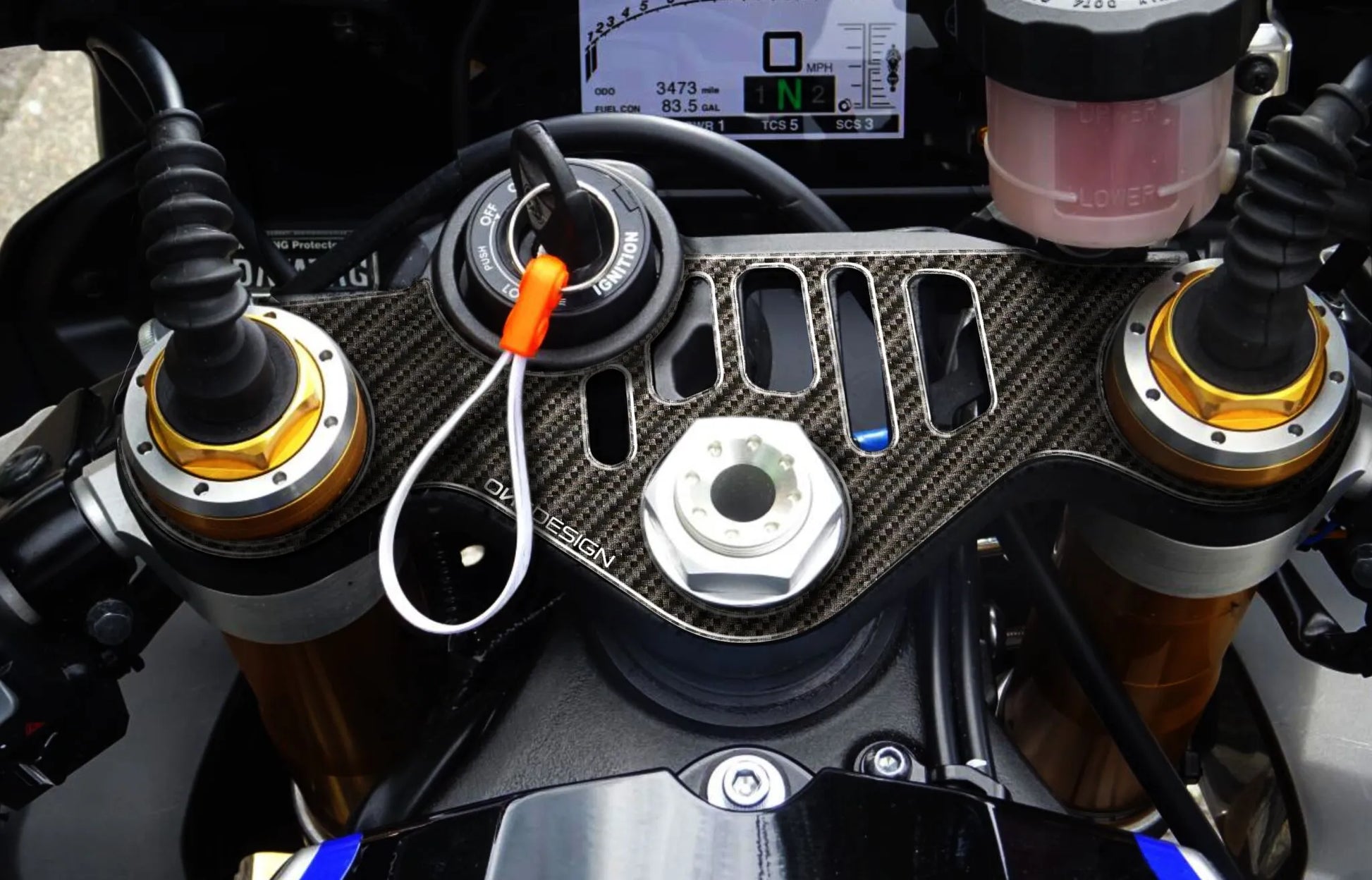 Protect your motorcycle's yoke with the Onedesign Yoke Protector. This stylish and high-quality resin part not only shields your bike from scratches and wear but also adds a touch of modern aesthetics with its carbon fiber graphic.