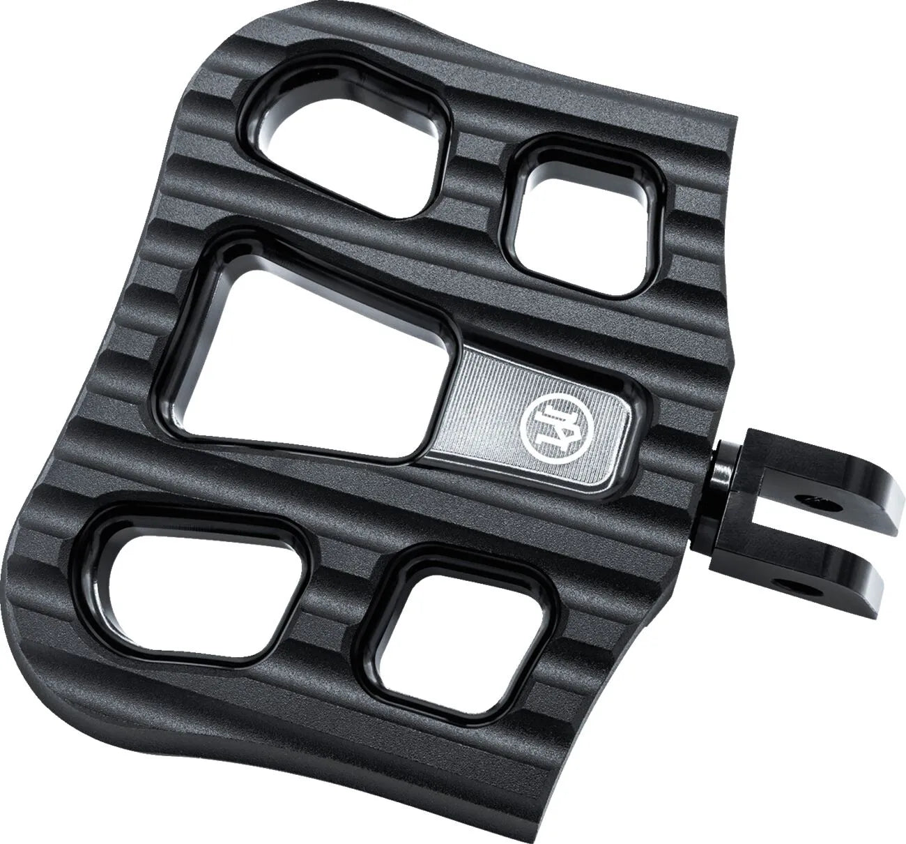 The PM Drifter Floorboards feature a slim, short profile that enhances ground clearance while retaining the convenience of utilizing OEM brackets. This design ensures seamless integration with factory mounting locations. Machined from durable billet aluminum with a sleek black finish, these floorboards provide a secure and comfortable platform for long rides. Upgrade your motorcycle's appearance and performance with these meticulously crafted floorboards, designed for enthusiasts seeking a blend of style and functionality. These standard floorboards are suitable for the driver position.