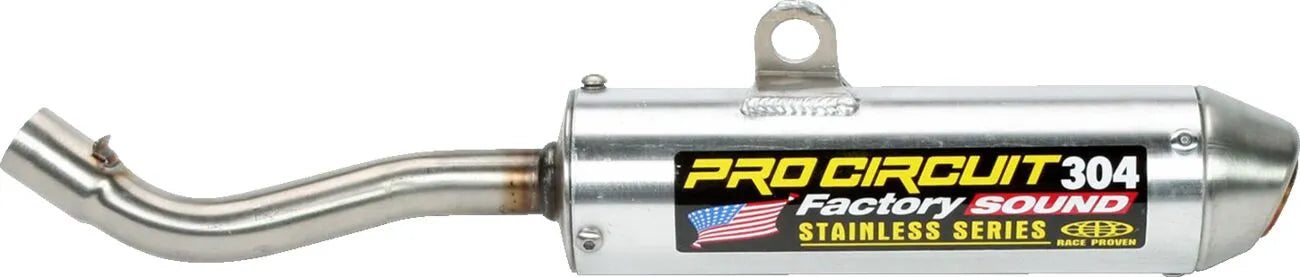 The Pro Circuit 304 Factory Sound Silencer is expertly designed as a superior replacement for your OEM silencer, offering significant performance benefits. Its longer midsection, compared to the R-304, contributes to a stronger mid-to-high RPM range, giving you the edge you need on the track or trail. The robust construction features a 6061 T-6 brushed aluminum housing for lightweight durability, coupled with stainless steel tubing and end cap for corrosion resistance and long life. The double-walled mounting brackets add to the silencer's overall strength and stability. With easy rebuild/repacking facilitated by steel Allen-head screws and exclusive E-glass pillow packing, maintaining your silencer is a breeze. The FIM-approved 304 stainless steel end cap ensures compliance with sound regulations without sacrificing performance. Upgrade to the Pro Circuit 304 silencer and experience the difference in sound and power.