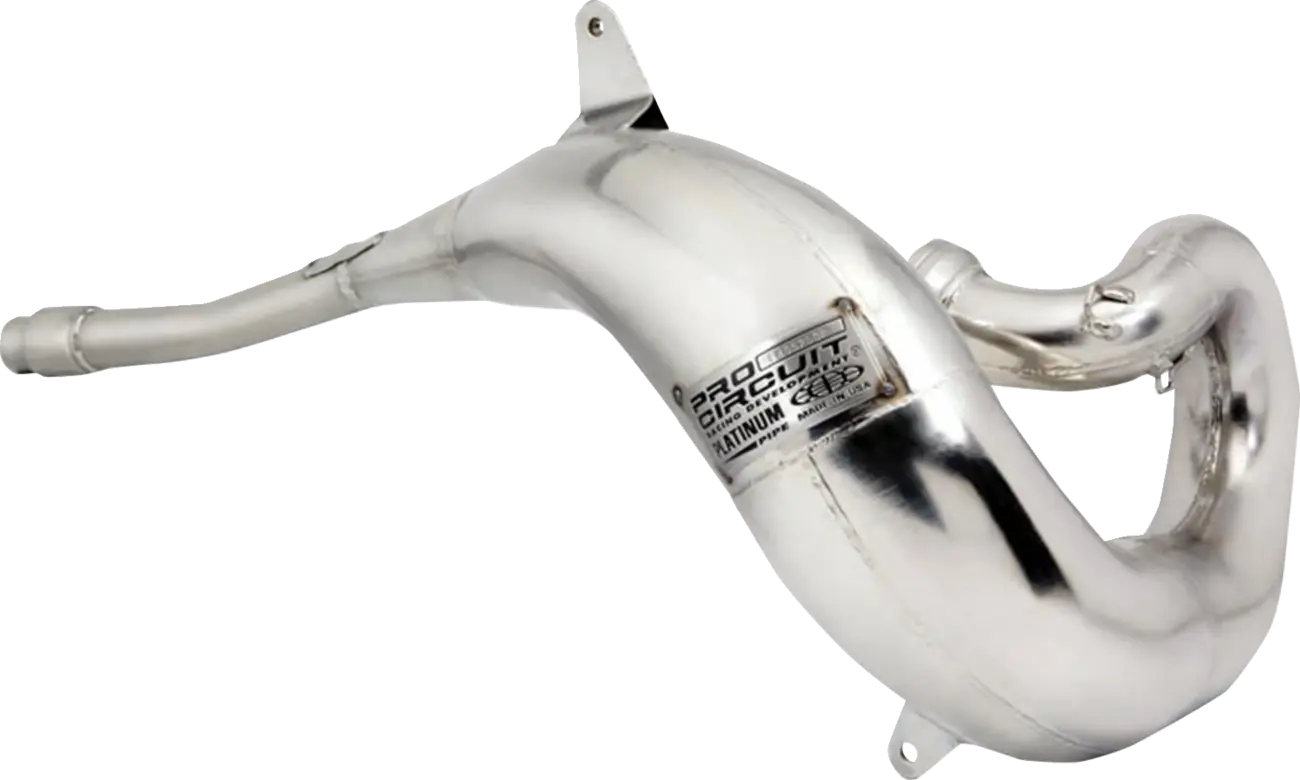 Experience the pinnacle of exhaust technology with the Pro Circuit Platinum Pipe. Constructed from stamped AKDQ high-quality carbon steel, this pipe features hand-welded and pounded seams for superior strength and longevity. The reinforced mounting brackets and stinger ensure a secure and stable fit, while the electoless nickel plating dramatically increases the part's lifespan, offering 2 to 10 times greater resistance to wear and corrosion. This exhaust system is meticulously crafted to optimize exhaust flow, resulting in noticeable gains in both horsepower and torque. Made in the USA, the Pro Circuit Platinum Pipe stands as a testament to quality and performance, making it an essential upgrade for any serious rider looking to enhance their machine's capabilities.