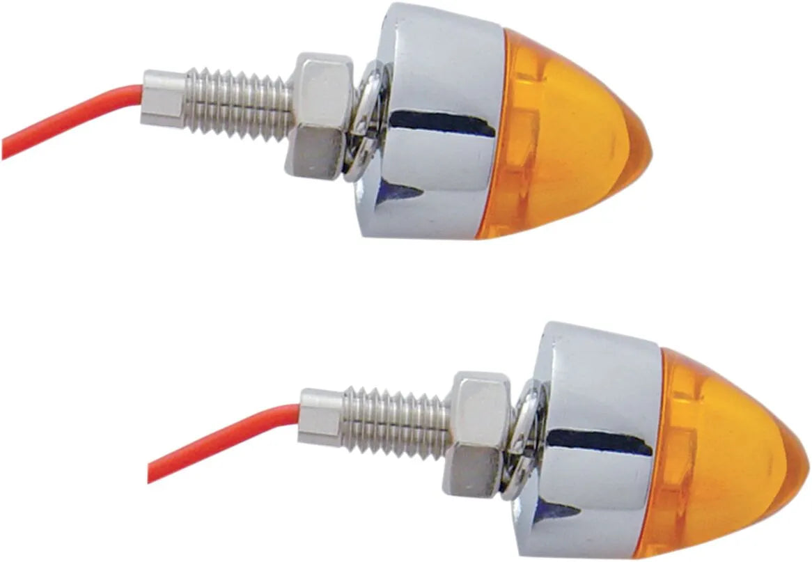 The Pro-One Bullet Mini Marker Lights feature a brilliant amber LED encased in a chrome bezel, providing excellent visibility while adding a touch of elegance to your motorcycle. The single-function LED ensures simplicity and reliability. Designed for easy installation, these marker lights utilize a self-grounding, single-wire hook-up system. Mount them securely using the integrated 6 mm stud and nut, making them a hassle-free addition to your bike. Sold in pairs, these mini bullet lights are perfect for custom builds and replacements alike. Illuminate your ride with Pro-One's signature style and quality.