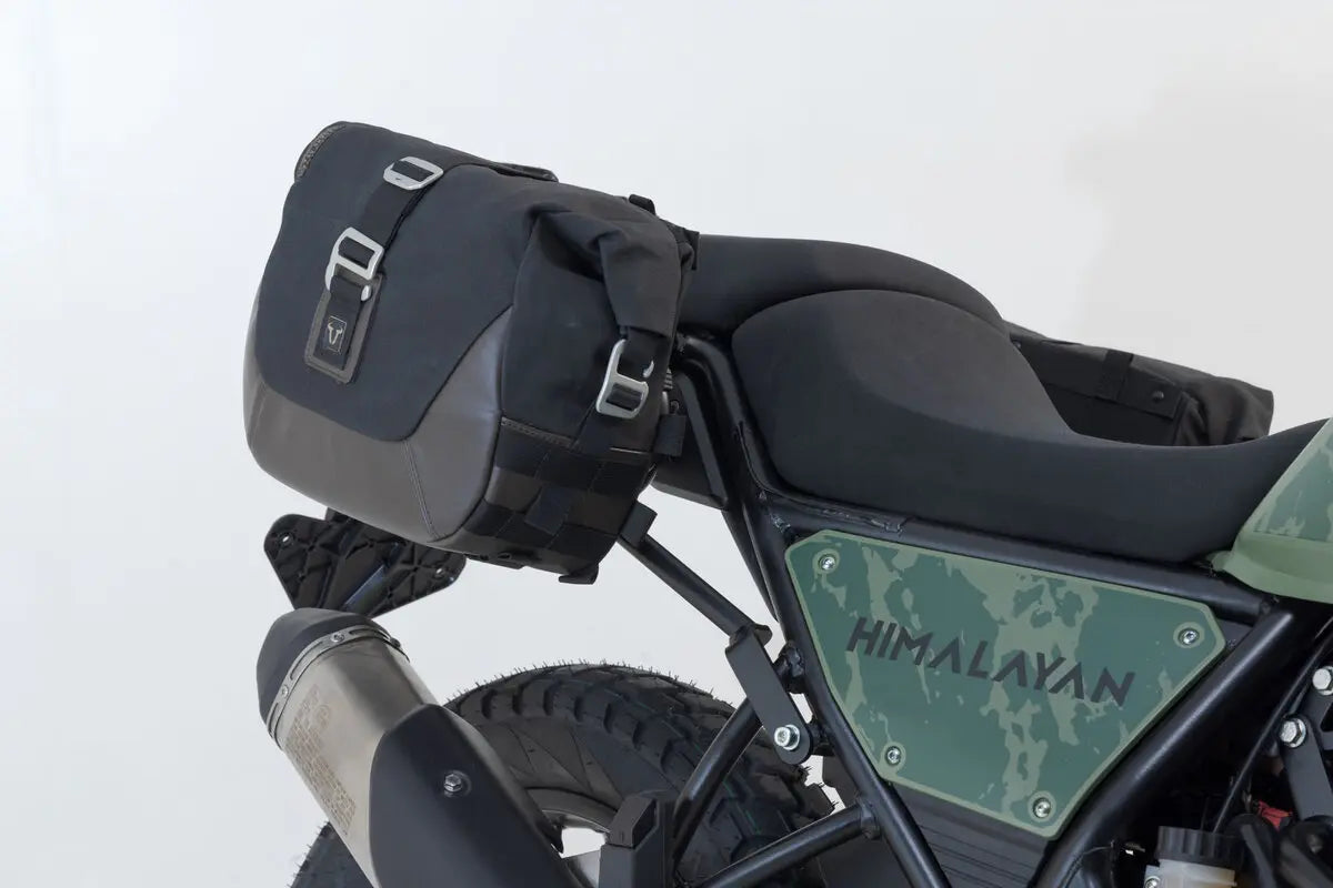 The Legend Gear LC1 and LC2 side bags attach and detach effortlessly from the SLC side carriers using a quick-lock system. These durable bags are constructed from Napalon synthetic leather and waxed canvas with a water-repellent PU coating, ensuring longevity and resistance to the elements. The included waterproof inner bags provide an extra layer of protection for your belongings. The SLC side carriers, crafted from robust tubular steel with a powder-coated black finish, offer a secure and stable foundation for the bags. Numerous loops allow for the attachment of accessory bags and smartphone pouches, expanding the system's versatility. The brown and black color scheme complements a wide range of motorcycle styles, enhancing the overall look of your bike.