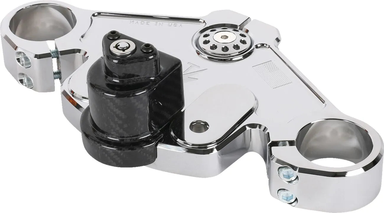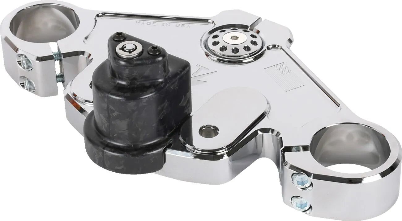 The Thrashin Supply Co. Top Tree offers two riser mounting locations, allowing you to tailor your bike's fitment with either the stock location or 1.35" closer to the rider. It comes equipped with a block-off plate for those who prefer to delete the OEM steering lock, and also allows for the use of your OEM steering lock and key by removing the block off plate. For an even cleaner look, consider adding the optional Carbon Fiber Lock Cover (sold separately). This top tree includes a billet stem cap and bolt, and requires no riser bushings for installation. All necessary hardware is included, and stock cables are compatible with total riser and bar heights up to 15". Proudly made in the USA, this top tree combines quality craftsmanship with functional design to elevate your riding experience.