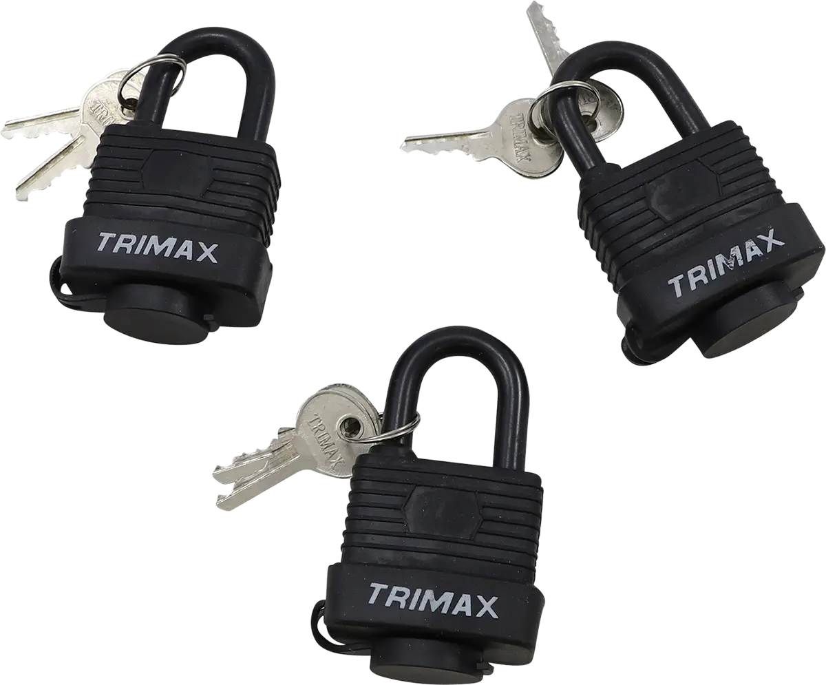 The Trimax Weatherproof Padlock features a rugged, weather-resistant PVC housing that shields a laminated solid brass lock body, ensuring long-lasting durability and resistance to corrosion. The dual-locking mechanism and a hardened shackle with a diameter of 5/16" (8 mm) provide exceptional security against tampering and cutting. This padlock is ideal for both indoor and outdoor use, offering reliable protection in various environments. The Trimax Weatherproof Padlock's robust construction and weatherproof design make it a dependable choice for safeguarding your property. Enjoy peace of mind knowing your belongings are protected by a high-quality, weather-resistant padlock.