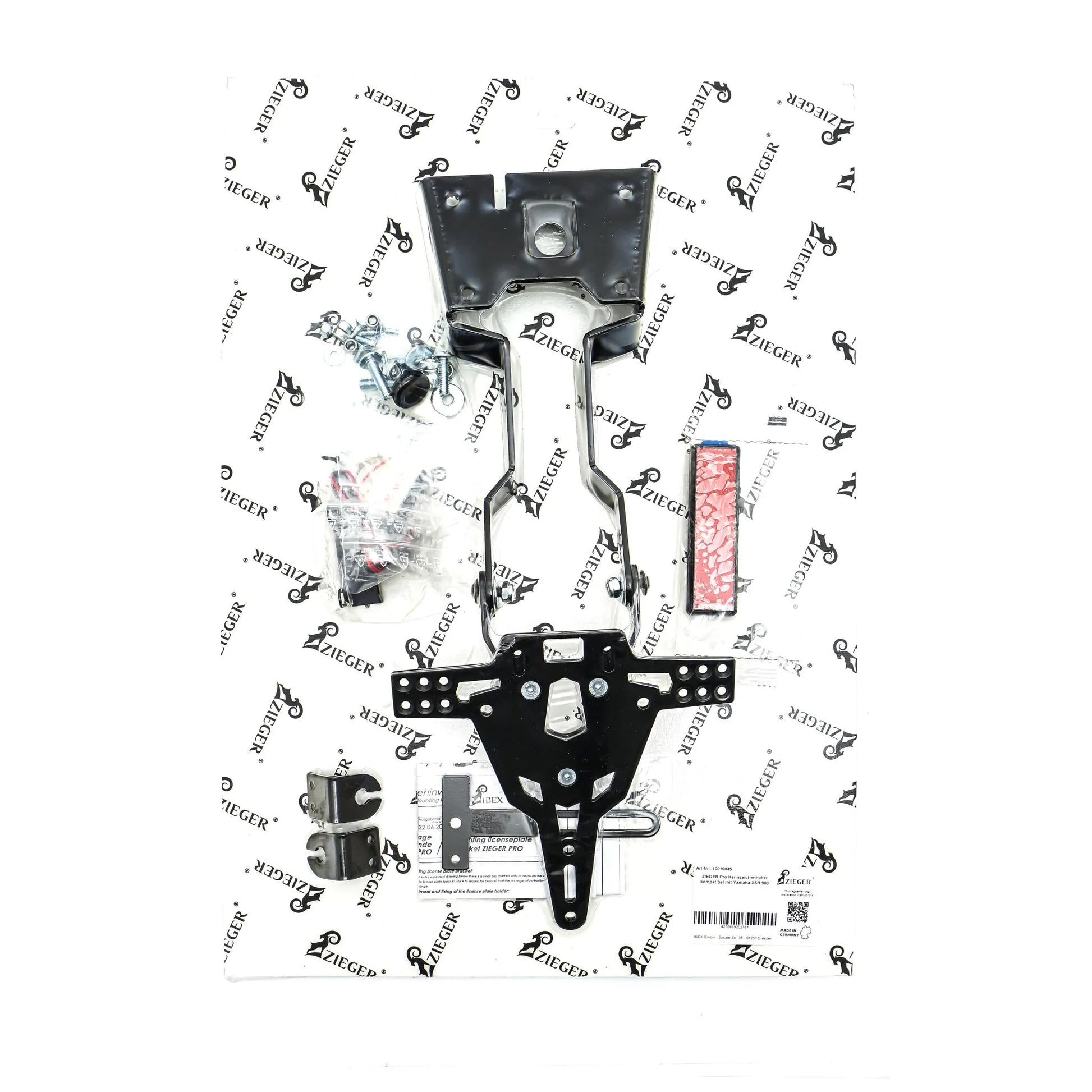 The Zieger Pro License Plate Holder enhances your bike's rear profile with its black powder-coated finish and streamlined design. Compatible with 175mm wide license plates, this holder requires no fairing modifications for installation, making it an easy and effective upgrade. You can fine-tune the rake angle steplessly for a customized look, while the adjustable indicator supports offer three different positions. The kit includes an "E approved" LED license plate light and a back light with support, ensuring visibility and safety. Countersunk bolts provide a flush mount for the license plate, adding to the clean, professional finish. The Type A (DE) is specifically designed to fit license plate sizes in Germany, Slovenia, Croatia, and the UK. Constructed from high-quality aluminum with a flat curvature, this bolt-on license plate holder guarantees a secure and stylish addition to your motorcycle.
