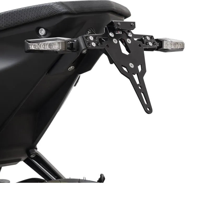 The Zieger Pro License Plate Holder is built to withstand the elements, featuring a black powder-coated finish for exceptional weather resistance and long-lasting durability. Designed to accommodate any license plate with a 175mm width, this holder requires no fairing modifications, ensuring a straightforward installation process. Enjoy stepless rake angle adjustment for a customized appearance. The indicator supports are adjustable in three positions, allowing for flexible placement. The kit includes an "E approved" LED license plate light with support, a back light with support and all necessary mounting hardware. This Type B holder is specifically designed to fit license plates in Austria, Czech Republic, Netherlands, Belgium, Greece, and Spain. Upgrade your motorcycle's aesthetics and ensure legal compliance with this high-quality license plate holder.Features & highlights