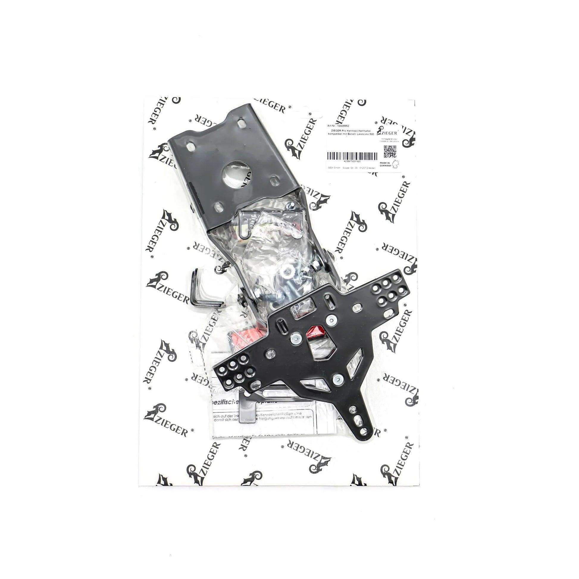 The Zieger Pro License Plate Holder is engineered for universal compatibility with 175mm width license plates, eliminating the need for fairing modifications. Its stepless rake angle adjustment and three-position adjustable indicator supports allow for a customized setup to perfectly match your motorcycle's style. Featuring countersunk bolts for a flush license plate mount, this holder ensures a seamless and professional installation. The kit includes an E-approved LED license plate light and backlight with support. Type C is specifically designed to fit license plate sizes in Switzerland, Poland, and Ireland. Enhance your motorcycle's rear profile with this high-quality, easy-to-install license plate holder.
